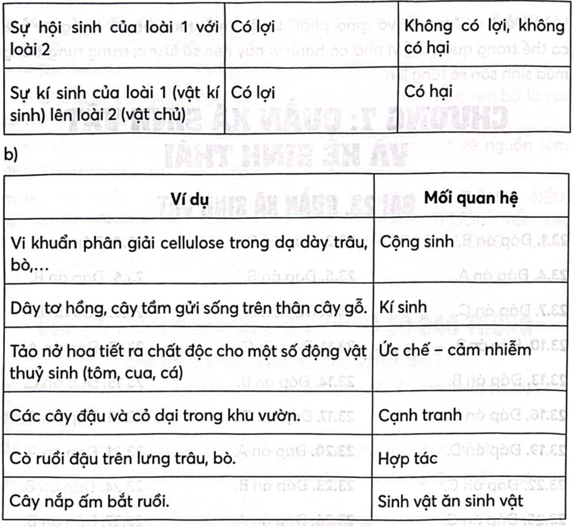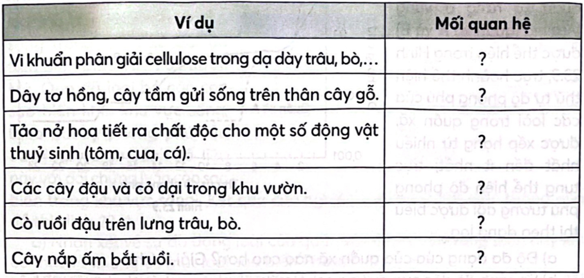 b) Xác định các ví dụ là mối quan hệ nào trong quần xã bằng cách hoàn thành bảng dưới đây.
