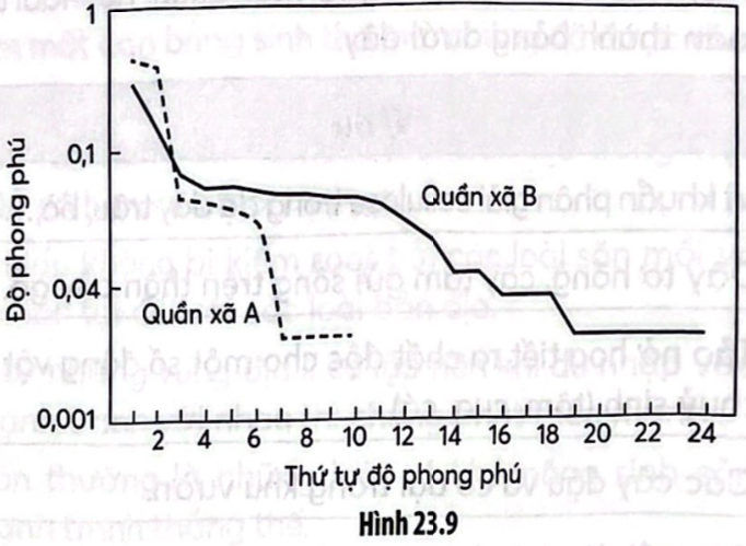 Câu 23.33: Đường cong mức độ phong phú của hai quần xã rừng ở vùng Virginia (quần xã A và B) được thể hiện trong Hình 23.9, trục hoành thể hiện thứ tự độ phong phú của các loài trong quần xã được xếp hạng từ nhiều nhất đến ít nhất; trục tung thể hiện độ phong phú tương đối được biểu thị theo dạng log10.