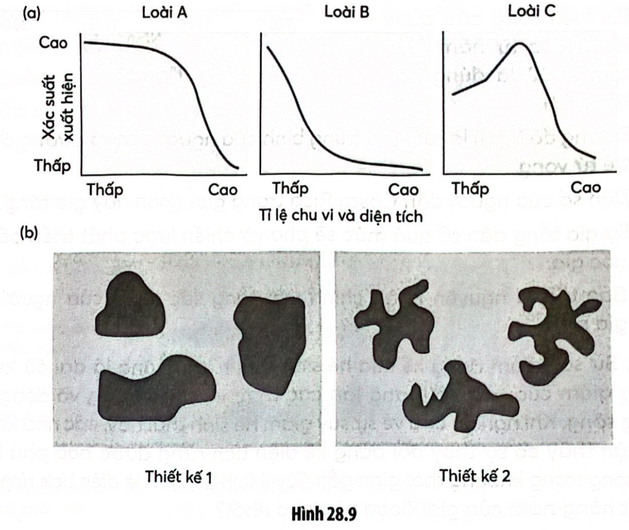 Câu 28.23: Trên thực tế, sự phân mảnh nơi ở (chia nhỏ nơi ở thành các vùng nhỏ hơn, biệt lập) ảnh hưởng tới sự đa dạng sinh học của quần xã. Một số loài bị ảnh hưởng tiêu cực bởi sự xuất hiện của vùng biên, trong khi một số loài khác thì môi trường sống vùng biên có lợi cho chúng. Chính vì vậy mà một trong những tiêu chí được sử dụng để thiết kế các khu bảo tồn tự nhiên là hình dạng của mảnh đất sống. Hình 28.9a cho thấy tần suất xuất hiện của ba loài chim đối với hình dạng của một mảnh đất sống, được ước tính dưới dạng tỉ lệ chu vi so với diện tích (nếu tỉ lệ cao tức là có nhiều vùng biên hơn so với diện tích trung tâm, nếu tỉ lệ thấp, tức là có ít vùng biên so với diện tích trung tâm).