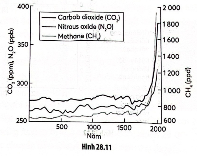 Câu 28.25: Để đánh giá các nguyên nhân cơ bản của biến đổi khí hậu, tác động tiềm tàng của nó đối với các hệ thống sinh thái và kinh tế xã hội cũng như các nhận thức và hành động của chúng ta nhằm hạn chế biến đổi khí hậu liên quan đến các hoạt động của con người, Tổ chức Khí tượng Thế giới và Chương trình Môi trường Liên Hợp Quốc đã thành lập Hội đồng liên chính phủ về biến đổi khí hậu (IPCC) vào năm 1988. IPCC triệu tập các nhóm chuyên gia về khoa học khí quyển và khí hậu để đánh giá các xu hướng về khí hậu và các nguyên nhân có thể xảy ra đối với bất kì thay đổi nào được quan sát thấy. Kết quả nghiên cứu được thể hiện ở Hình 28.11.