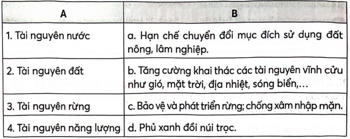 Câu 28.5: Cho thông tin về các tài nguyên thiên nhiên (cột A) và một số biện pháp sử dụng hợp lí nguồn tài nguyên (cột B) như sau: