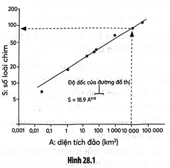 Câu 28.6: Nhiều loài sinh vật đã tuyệt chủng hoặc bị đe dọa tuyệt chủng do những biến đối tự nhiên của hệ sinh thái hoặc do tác động của con người. Khi nghiên cứu về mối tương quan giữa diện tích đảo và số lượng các loài chim trên đảo, các nhà khoa học đã thu được số liệu như Hình 28.1. Giả sử do những biến đổi của điều kiện tự nhiên, diện tích trên hòn đảo này giảm từ 10 000 km xuống còn 1000 km thì khoảng bao nhiêu phần trăm loài sẽ bị biến mất?