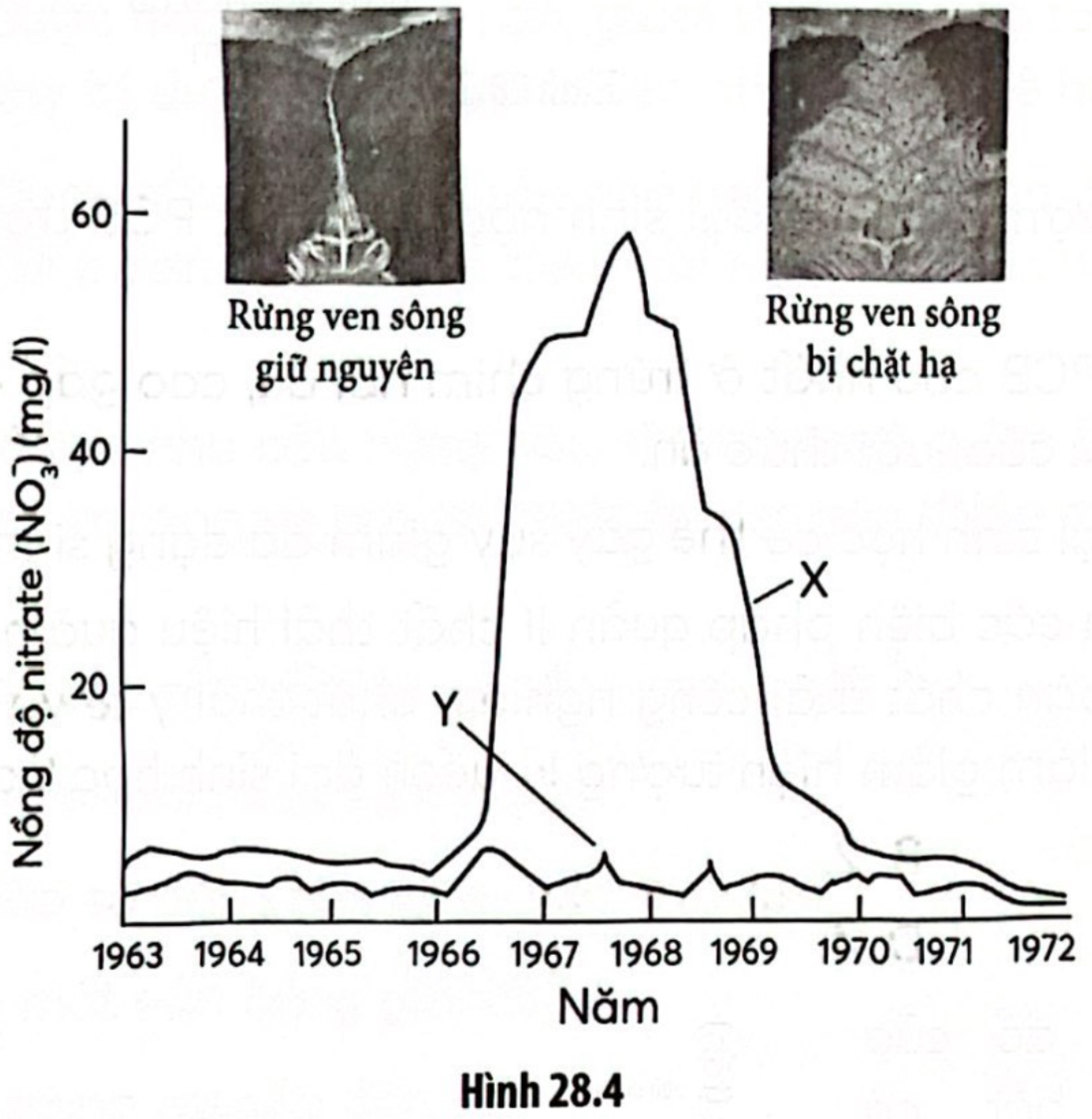 Câu 28.17: Đồ thị Hình 28.4 biểu diễn sự thay đổi hàm lượng nitrogen trong hai dòng sông. Cả hai dòng sông đều có đặc điểm là nước chảy chậm và nằm gần hai khu rừng có diện tích gần tương đương nhau. Tuy nhiên, có một sự khác biệt quan trọng giữa hai khu rừng này: một khu rừng chịu tác động của nạn phá rừng mạnh mẽ vào những năm 1965, trong khi khu rừng còn lại không bị tác động. Phát biểu nào sau đây về sự thay đổi hàm lượng nitrogen trong hai dòng sông này là không đúng?