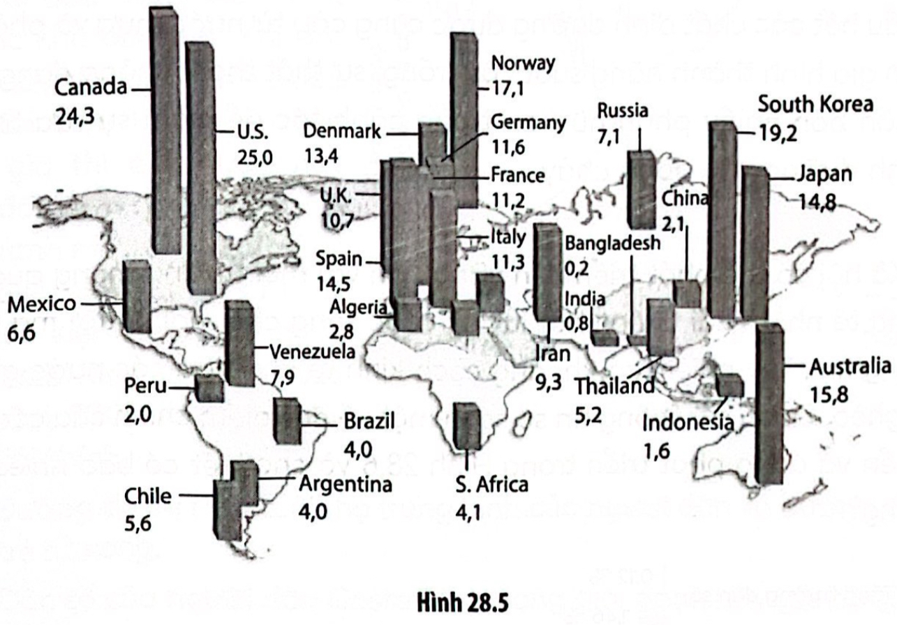 Câu 28.18: Việc sử dụng tài nguyên trên thế giới có sự khác nhau giữa các khu vực. Hình 28.5 mô tả về số thùng dầu trung bình được sử dụng cho mỗi người/năm ở các quốc gia khác nhau. Kết luận nào sau đây chính xác?