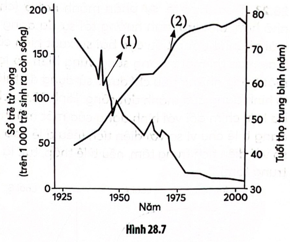a) Đường đồ thị (1) là tuổi thọ trung bình của người dân và đường đồ thị (2) là số trẻ tử vong.