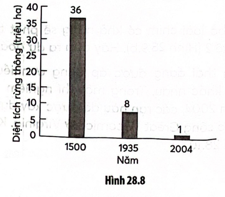 Câu 28.22: Sự suy giảm đáng kể của hệ sinh thái rừng thông lá dài đã kéo theo sự suy giảm của một số lượng lớn các thực vật, côn trùng và động vật có xương sống. Khi nghiên cứu về sự suy giảm hệ sinh thái này, các nhà khoa học đã nhận thấy có sự thay đổi đáng kể diện tích rừng được bao phủ bởi các cây thông trong khoảng thời gian gần đây (Hình 28.8). Tỉ lệ diện tích rừng thông bị mất của giai đoạn nào cao nhất?