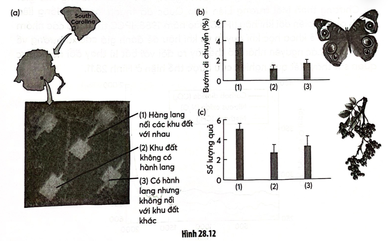 Câu 28.26: Hành lang môi trường sống là con đường di chuyển giữa các khu vực của môi trường sống. Hành lang môi trường sống giúp cho một số loài sinh vật tránh được sự cô lập về tìm kiếm thức ăn, nước và đối tác sinh sản. Các nhà khoa học đã quan sát sự di chuyển của loài bướm Junonia coenia giữa các khoảng đất và việc thụ phấn cho cây đào đông lex verticillata theo từng vùng. Kết quả được thể hiện ở Hình 28.12.