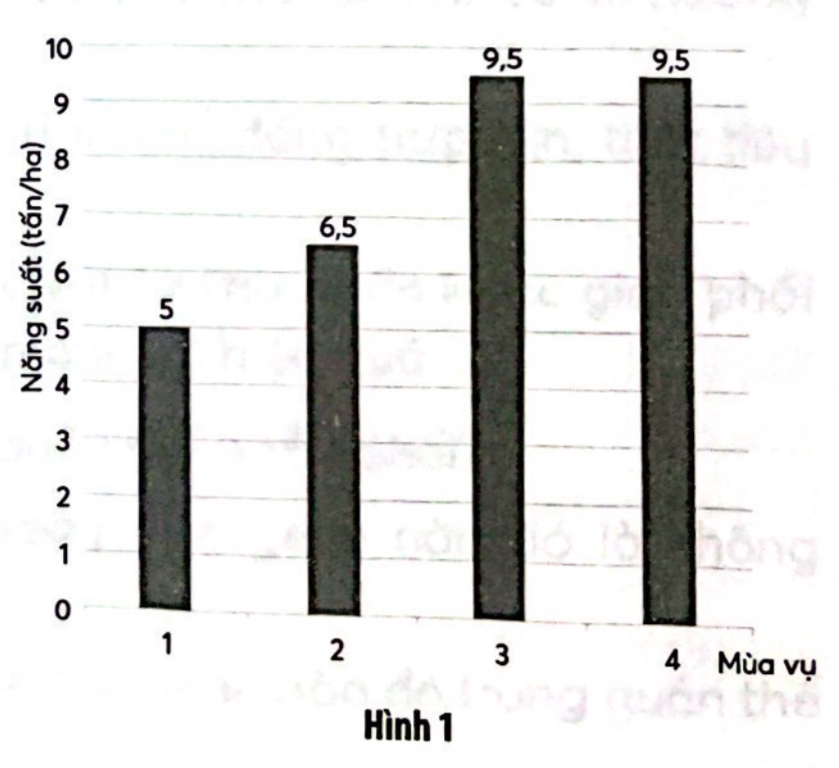 Câu 2: Một người nông dân chọn giống lúa A để gieo trồng. Trong mùa vụ đầu, do chưa có kinh nghiệm canh tác nên chỉ thu hoạch được 5 tấn/ha. Ở các mùa vụ sau, ông đã thay đổi nhiều phương pháp canh tác khác nhau với mong muốn đạt được năng suất cao hơn. Kết quả năng suất của bốn vụ gieo trồng được mô tả trong Hình 1.