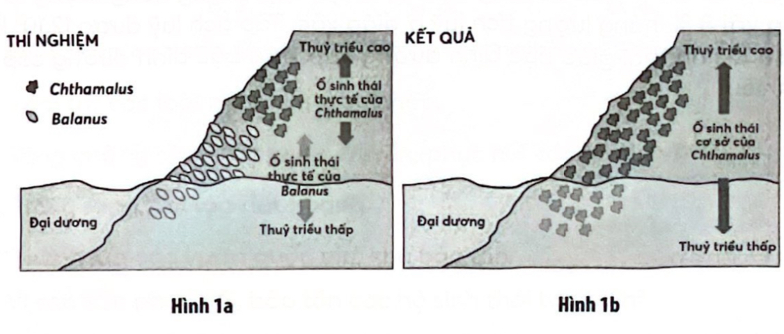 Câu 1: Tất cả các nguồn sống vô sinh và hữu sinh trong môi trường được một loài sử dụng được gọi là ổ sinh thái của loài đó. Nhà sinh thái học Joseph Connell đã nghiên cứu hai loài hà sống ở biển là Chthamalus stellatus và Balanus balanoides, chúng phân bố trên các tầng cao - thấp khác nhau trên vách đá dọc bờ biển Scottland. Loài hà Chthamalus thường sống ở vùng cao hơn so với vùng sống của Balanus (Hình 1a). Để xác định sự phân bố của loài hà Chthamalus có chịu tác động cạnh tranh khác loài với Balanus hay không, Connell đã loại bỏ Balanus khỏi một số chỗ trên vách đá. Kết quả là loài Chthamalus phát triển lan rộng sang các vùng trước đây mà Balanus đã sống (Hình 1b).