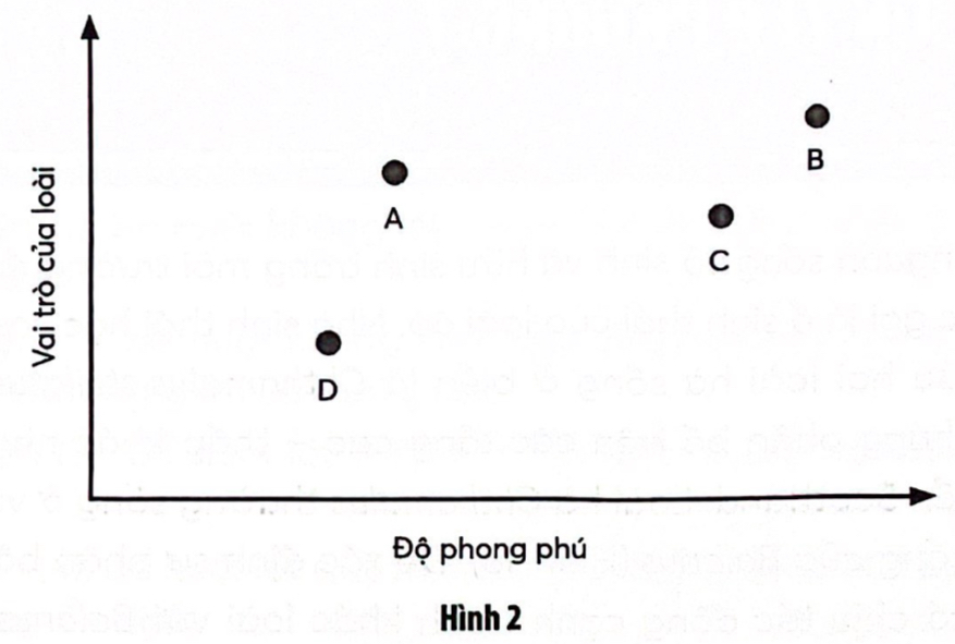 Câu 2: Đồ thị Hình 2 mô tả độ phong phú và vai trò đối với quần xã của bốn loài khác nhau. Dựa vào đồ thị hãy xác định các nhóm loài ưu thế, loài chủ chốt, loài thứ yếu, loài ngẫu nhiên trong quần xã. Giải thích.