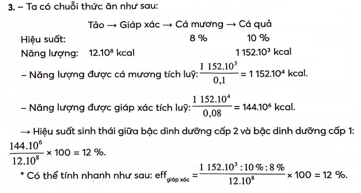 Câu 3: Giả sử trong một hồ tự nhiên, tảo là thức ăn của giáp xác; cá mương sử dụng giáp xác làm thức ăn đồng thời lại làm mồi cho cá quả. Cá quả tích luỹ được 1152.103 kcal, tương đương 10% năng lượng tích luỹ ở bậc dinh dưỡng thấp liền kề với nó. Cá mương tích luỹ được một lượng năng lượng tương đương với 8% năng lượng tích luỹ ở giáp xác. Tảo tích luỹ được 12.108 kcal. Hiệu suất sinh thái giữa bậc dinh dưỡng cấp 2 và bậc dinh dưỡng cấp 1 là bao nhiêu?