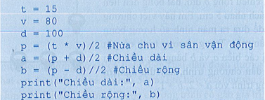 Câu F17 trang 24 SBT Tin 10: Một sân vận động có dạng hình chữ nhật. Lan đi bộ vòng quanh sân vận động hết t phút, mỗi phút đi được v mét. Biết chiều dài sân vận động hơn chiều rộng là d mét. Chương trình ở hình sau thực hiện tính chiều dài và chiều rộng của sân vận động. Đầu chương trình gán giá trị t, d, v tương ứng bằng 15, 80, 100.