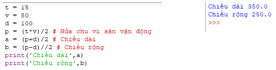 2) Sai vì kết quả chạy chương trình là: Chiều dài: 355.5, Chiều rộng 244. Chiều dài dài hơn chiều rộng là 111.5. Sửa câu lệnh b = (p - d) // 2 thành b = (p - d)/ 2.