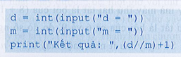 Câu F25 trang 27 SBT Tin 10: Một đoàn tổ chức đi du lịch bằng phương tiện cá nhân. Độ dài toàn hành trình là d km. Mỗi ngày đoàn đi được m km. Đoàn xuất phát từ buổi sáng ngày thứ nhất. Hãy viết chương trình xác định ngày thứ mấy thì đoàn được ăn bữa tối đầu tiên tại điểm đích (coi thời gian giữa hai buổi sáng liên tiếp là một ngày). Dữ liệu vào là các số nguyên dương d và m được nhập vào từ bàn phím. Kết quả đưa ra màn hình (có thể đưa ra chú thích tuỳ chọn trước mỗi phép nhập dữ liệu và trước mỗi kết quả).