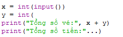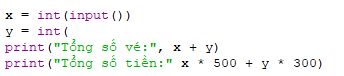Câu F22 trang 26 SBT Tin 10: Một trận đấu bóng giữa hai đội sẽ diễn ra trên sân vận động gồm hai loại chỗ ngồi: ghế ở hàng trước có giá là 500 nghìn đồng, ghế ở hàng sau có giá là 300 nghìn đồng. Ban tổ chức đã bán được x vé cho ghế hàng trước và y vé cho ghế hàng sau. Em hãy hoàn thiện chương trình dưới đây để nhập vào các biến x, y và đưa ra tổng số vé bán ra và tổng số tiền bán vé.
