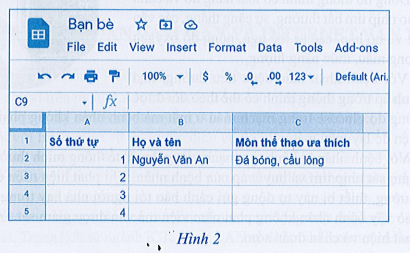 Trong ứng dụng Google Sheets, em hãy tạo tệp dữ liệu “Bạn bè” với nội dung tương tự như ở Hình 2