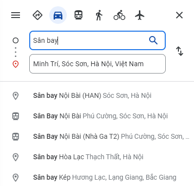 Nhập “Sân bay Nội Bài” vào vùng tìm nơi đi, phần mềm cũng có chức năng gợi ý địa danh.