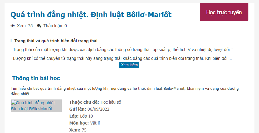 Chọn bài giảng điện tử muốn học, ví dụ bài "Quá trình đẳng nhiệt – định luật boyle mariotte". Nháy chuột vào tên bài để mở bài học, sau đó nháy chuột vào nút "Học trực tuyến" để xem video bài học.