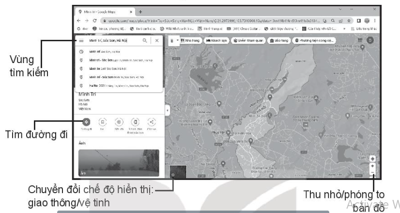 Để xem bản đồ một vùng nào đó, em nhập địa danh vào vùng tìm kiếm, ví dụ "xã Minh Trí". Trong quá trình gõ, phần mềm sẽ gợi ý, nếu thấy xuất hiện đúng địa danh chỉ cần nháy chuột vào tên để xác nhận. Bản đồ sẽ được hiển thị hế độ đường giao thông, có thể thu nhỏ/phóng to (zoom) bản đồ hay chuyển đổi chế độ hiển thị giữa bản đồ giao thông và bản đồ vệ tinh.