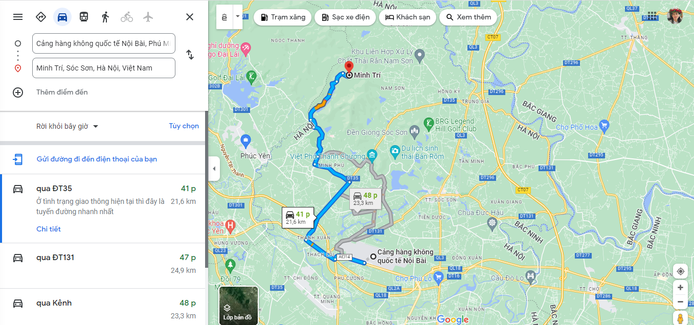 c) Ví dụ tìm đường đi từ Sân bay Nội Bài về xã Minh Trí.