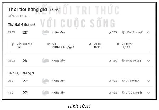 + Nếu nháy chuột vào nút "Các giờ tới", sẽ được thông tin thời tiết tới từng giờ như trong Hình 10.11 với các thông tin về nhiệt độ, độ ẩm, tốc độ và hướng gió, chỉ số tia cực tím.