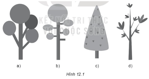 - Cây ở Hình 12.1c có phần lá vẽ bằng hình tam giác, các đoạn chấm trên cây cũng được vẽ bằng hình tam giác với kích thước nhỏ hơn và tô màu đậm hơn.