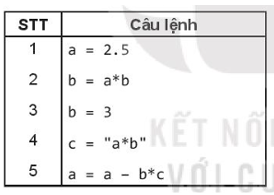 Câu lệnh thứ 5 sai vì vế bên phải biến c là dữ liệu kiểu xâu kí tự nên không thể tham gia trong phép toán số học với biến b là dữ liệu kiểu số thực.