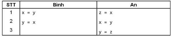 - Trong chương trình của An, sau câu lệnh thứ nhất giá trị của x được lưu lại bằng biến z, sau khi thực hiện câu lệnh thứ hai giá trị của biến y được gán cho biến x; câu lệnh thứ ba trong chương trình của An gán giá trị của biến z: (chính là giá trị của x đã được xác định từ trước).