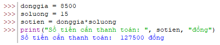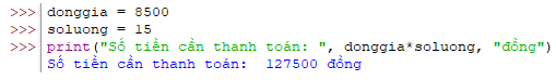print("Số tiền cần thanh toán: ", dongia*soluong, "đồng")