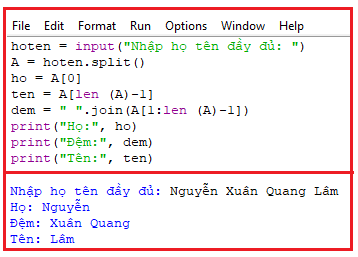 Câu 25.8 trang 53 SBT Tin học 10: Viết chương trình nhập một xâu là họ tên đầy đủ (gồm họ, đệm, tên) từ bàn phím, sau đó in ra màn hình lần lượt họ, đệm và tên vừa nhập. Ví dụ: