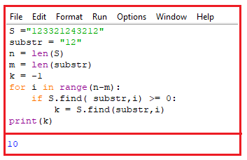 Câu 25.10 trang 53 SBT Tin học 10: Cho trước xâu kí tự S và xâu substr. Dùng các lệnh nào để biết được vị trí xuất hiện cuối cùng của xâu substr trong xâu S? Ví dụ nếu S ="123321243212", substr = "12" thì vị trí xuất hiện lần cuối của "12" trong xâu S sẽ là 10. Nếu không thấy sẽ trả về -1,