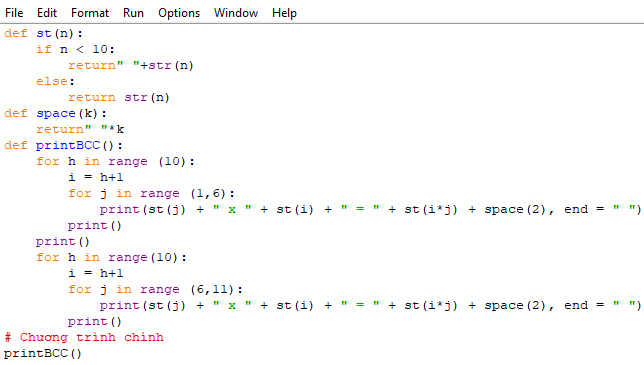 Từ yêu cầu của đề bài chúng ta sẽ thiết lập thủ tục chính printBCC() có chức năng in bảng cửu chương. Thủ tục này sẽ có hai phần độc lập, phần đầu in 5 khối thuộc hàng thứ nhất là bảng cửu chương của các số 1, 2, 3, 4, 5. Phần sau của thủ tục sẽ in 5 khối thuộc hàng thứ hai là bảng cửu chương của các số 6, 7, 8, 9, 10.