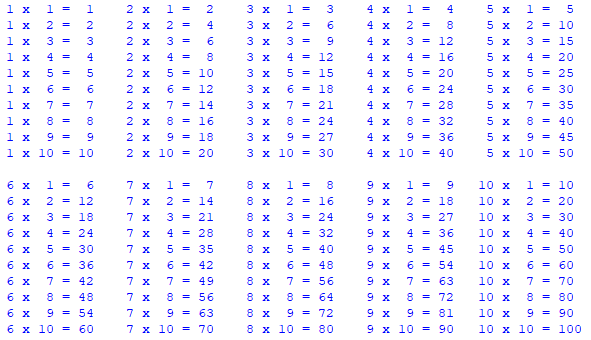 print(st(j) + " x " + st(i) + " = " + st(i*j) + space(2), end = " ")