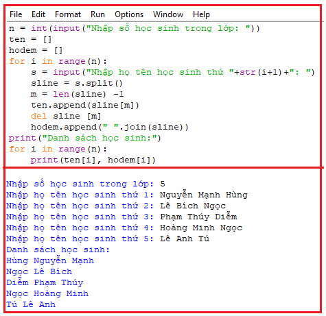 Mỗi họ tên được nhập sẽ được tách ra thành tên và họ đệm bằng hàm split(). Các tên học sinh sẽ được đưa vào dãy ten, các họ đệm sẽ được đưa vào dãy hodem. Sau khi nhập xong thì in ra danh sách các tên và họ đệm này.