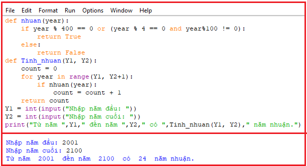 * Chương trình chạy thử tính năm nhuận của thế kỉ XXI như sau: