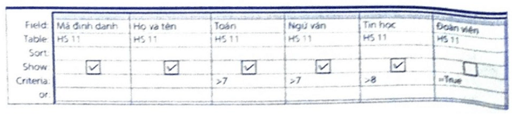 – Các bản ghi kết quả chỉ hiển thị các trường: Mã định danh, Họ và tên, Toán, Ngữ văn, Tin học.