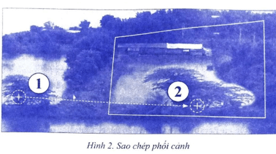 Chọn kích thước bút phù hợp, không vượt quá phạm vi vùng ảnh cần lấy mẫu. Độ cứng (Hardness) thay đổi từ 15 đến 30. Độ ấn (Force) thay đổi từ 10 đến 70. – Nháy chuột vào điểm xuất phát trên ảnh mẫu (gốc cây ở vị trí 1, Hình 2). - Chọn một điểm xuất phát cần tạo ảnh đồng dạng phối cảnh (vị trí 2, Hình 2), từ đó nháy chuột và kéo thả chuột để vẽ ảnh đồng dạng. Trong quá trình kéo thả chuột, quan sát con trỏ chuột di chuyển trên vùng ảnh mẫu để đảm bảo chỉ di chuyển chuột trong phạm vi cần vẽ hình.