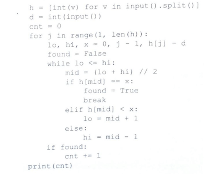 Câu Fcs29 trang 55 SBT Tin học 11: Xét bài toán: Một hàng dọc gồm n bạn học sinh xếp theo thứ tự từ thấp đến cao, bạn thứ i (0 <i≤n − 1) có chiều cao là h (cm). Em hãy viết chương trình, với độ phức tạp O(nlog,n), sử dụng thuật toán tìm kiếm nhị phân để tính số cách chọn một cặp học sinh trong hàng sao cho chênh lệch chiều cao của hai bạn ấy bằng đúng giá trị d (cm) cho trước.