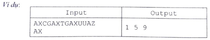 Kết quả: Hiển thị ở thiết bị ra chuẩn các số nguyên là những vị trí mà ta tìm thấy được T ở trong S.