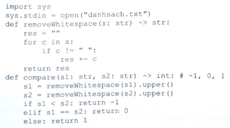 Gợi ý: Một xâu 4 độ dài 1, được gọi là đứng trước xâu B độ dài 1, theo thứ tự từ điển, nếu sau khi loại bỏ toàn bộ khoảng trắng, tồn tại vị trí i đầu tiên sao cho khi so sánh thứ tự trong bảng chữ cái, A #B và 4 đứng trước B; hoặc 1, ≤ 1 và A = B với mọi i<I