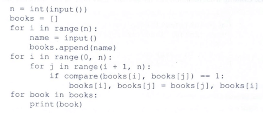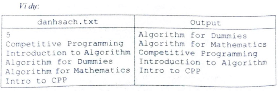 - n dòng sau, mỗi dòng là một xâu biểu thị tên của một quyển sách. Dữ liệu đảm bảo tên chỉ gồm các chữ cái Latinh in hoa hoặc in thường cùng với dấu cách, giữa hai từ liên tiếp nhau chỉ chứa đúng một dấu cách và không có hai quyển sách nào trùng tên nếu không tính in hoa hoặc in thường. Kết quả: Hiển thị ở thiết bị ra chuẩn: