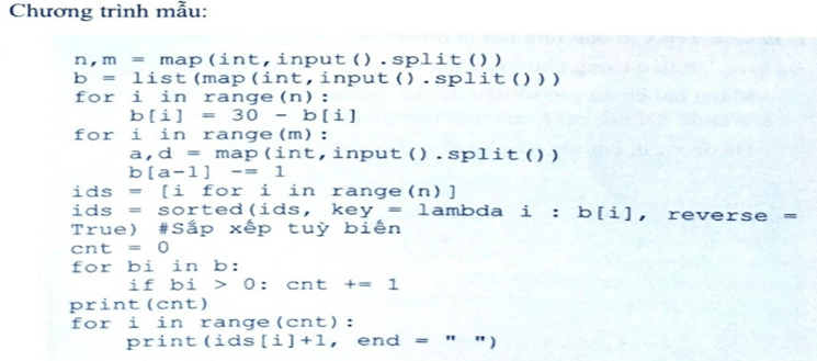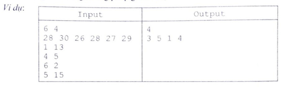 m dòng cuối cùng, mỗi dòng chứa thông tin dưới dạng “a d” tức là người a xin nghỉ phép vào ngày d (1 <aŚn, 1<d<30) (giả sử tháng đang hỏi có 30 ngày). Dữ liệu vào đảm bảo trong cùng một ngày, mỗi nhân viên chỉ xin phép tối đa một lần.
