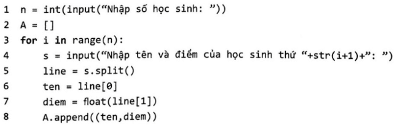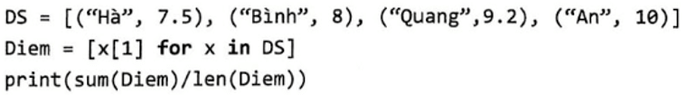 DS = [(“Hà”, 7.5), (“Bình”, 8), (“Quang”,9.2), (“An”, 10)]
