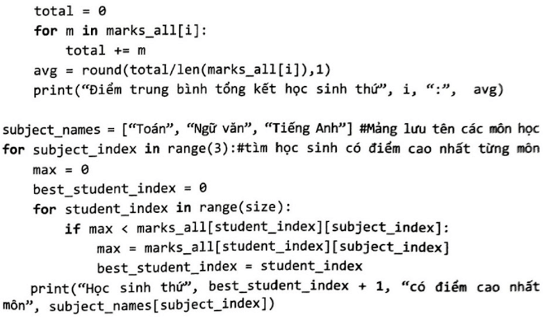 Câu 18.6 trang 64 SBT Tin học 11: Em hãy lưu điểm tổng kết ba môn học Toán, Ngữ văn, Tiếng Anh của các học sinh vào một mảng hai chiều, mỗi dòng là điểm của một học sinh theo thứ tự Toán, Ngữ văn, Tiếng Anh. Sau đó tính điểm trung bình cả ba môn của mỗi học sinh và số thứ tự của học sinh có điểm cao nhất mỗi môn học. Trường hợp nhiều học sinh cùng đạt điểm cao nhất trong một môn học thì chỉ cần in ra số thứ tự của học sinh đầu tiên.