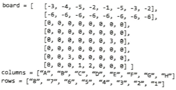 Câu 18.8 trang 65 SBT Tin học 11: Viết chương trình khai báo một mảng hai chiều 8x8 biểu diễn trạng thái của một bàn cờ vua. Giá trị một ô bàn cờ là 0 nếu không có quân cờ. Bên quân trắng sử dụng giá trị 1 đến 6 lần lượt cho các quân vua, hậu, xe, mã, tượng, tốt của bên trắng. Tương tự quân đen sử dụng giá trị -1 đến -6. Các cột bàn cờ được kí hiệu bằng các kí tự A, B, C, D, E, F, G, H trong khi đó các dòng được kí hiệu bằng số 1 đến 8 từ dưới lên.