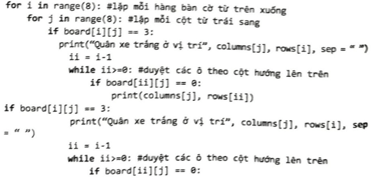 Gợi ý: Đầu tiên cần tìm vị trí các quân xe trắng bằng cách dùng hai vòng lặp duyệt qua tất cả các hàng và cột của mảng hai chiều tìm các ô có giá trị là 3 (ứng với quân xe trắng). Vì con xe có thể đi dọc và ngang nên để tìm các ô nó có thể đi chỉ cần duyệt từ vị trí mỗi con xe theo 4 hướng trên, dưới, trái, phải cho đến khi gặp một quân cờ khác hoặc đến biên bàn cờ.