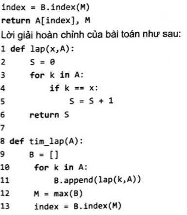 Câu 27.1 trang 80 SBT Tin học 11: Cho trước dãy số A, cần tìm một phần tử được lặp lại nhiều nhất đồng thời với số lần lặp trong A. Ví dụ nếu A = [1, 3, 5, 0, 1, 2, 3, 4, 10, 1] thì lời giải cần trả về bộ giá trị (1, 3).