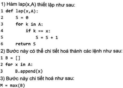 Với bài toán trên, một người thiết kế đã phác thảo các bước thực hiện như sau: 1) Thiết lập hàm lap(x) tính số lần lặp của phần tử x trong A.