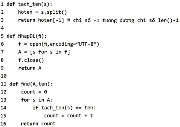 Câu 27.6 trang 81 SBT Tin học 11: Viết chương trình nhập danh sách họ tên các bạn lớp em. Danh sách này được lưu trong tệp văn bản HS.inp, mỗi dòng ghi tên đầy đủ của một học sinh bao gồm cả họ, tên đệm và tên. Sau đó, nhập từ bàn phím một họ, ví dụ nhập Nguyễn". Chương trình kiểm tra và thông báo, ví dụ: Lớp em có 4 bạn họ Nguyễn.