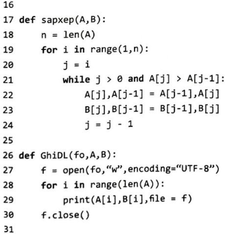 - Hàm sapxep(A,B) có chức năng sắp xếp đồng thời hai dãy A, B theo tiêu chí tăng dần của A.